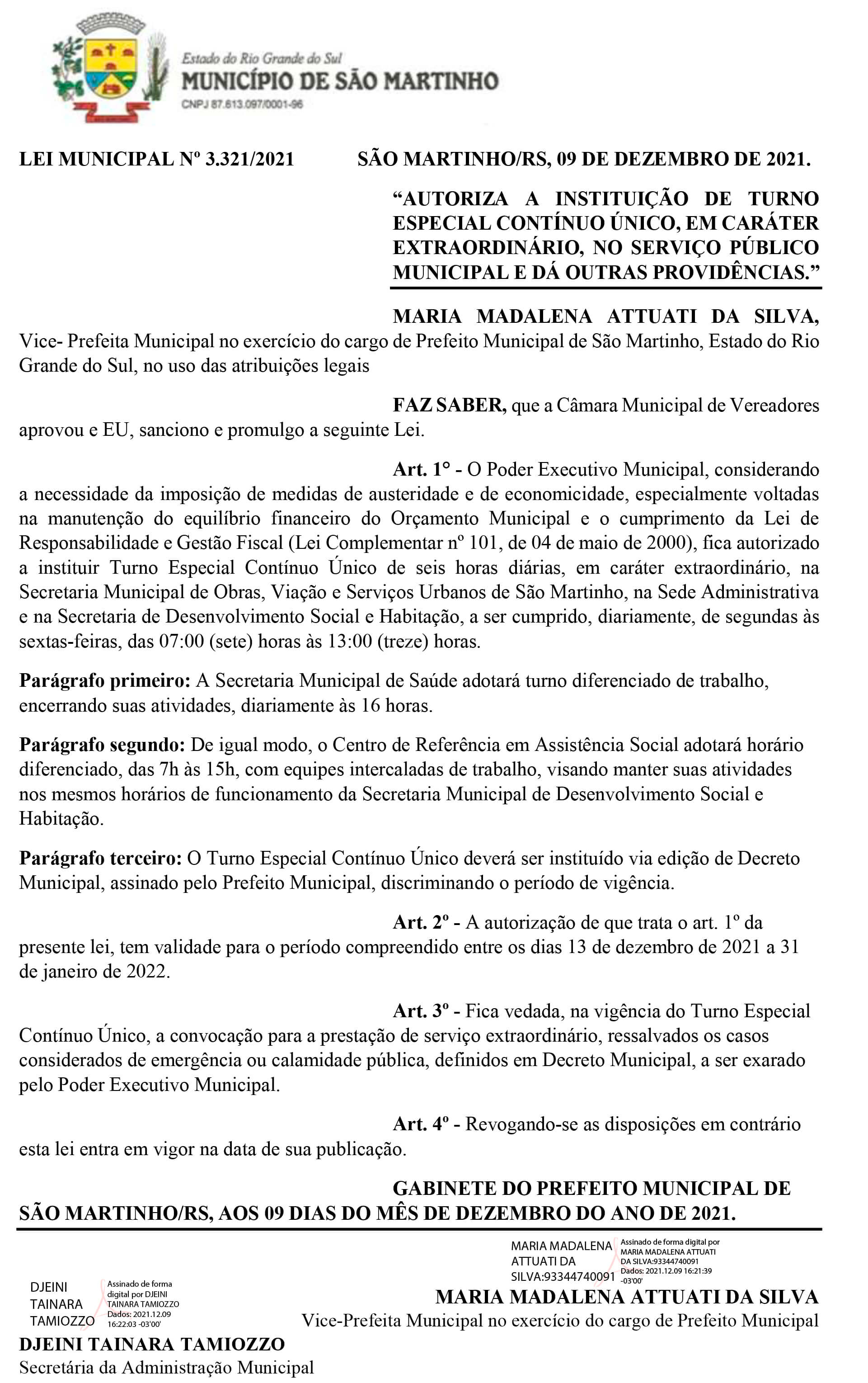 LEI MUNICIPAL Nº 3.321/2021 SÃO MARTINHO/RS, 09 DE DEZEMBRO DE 2021.
