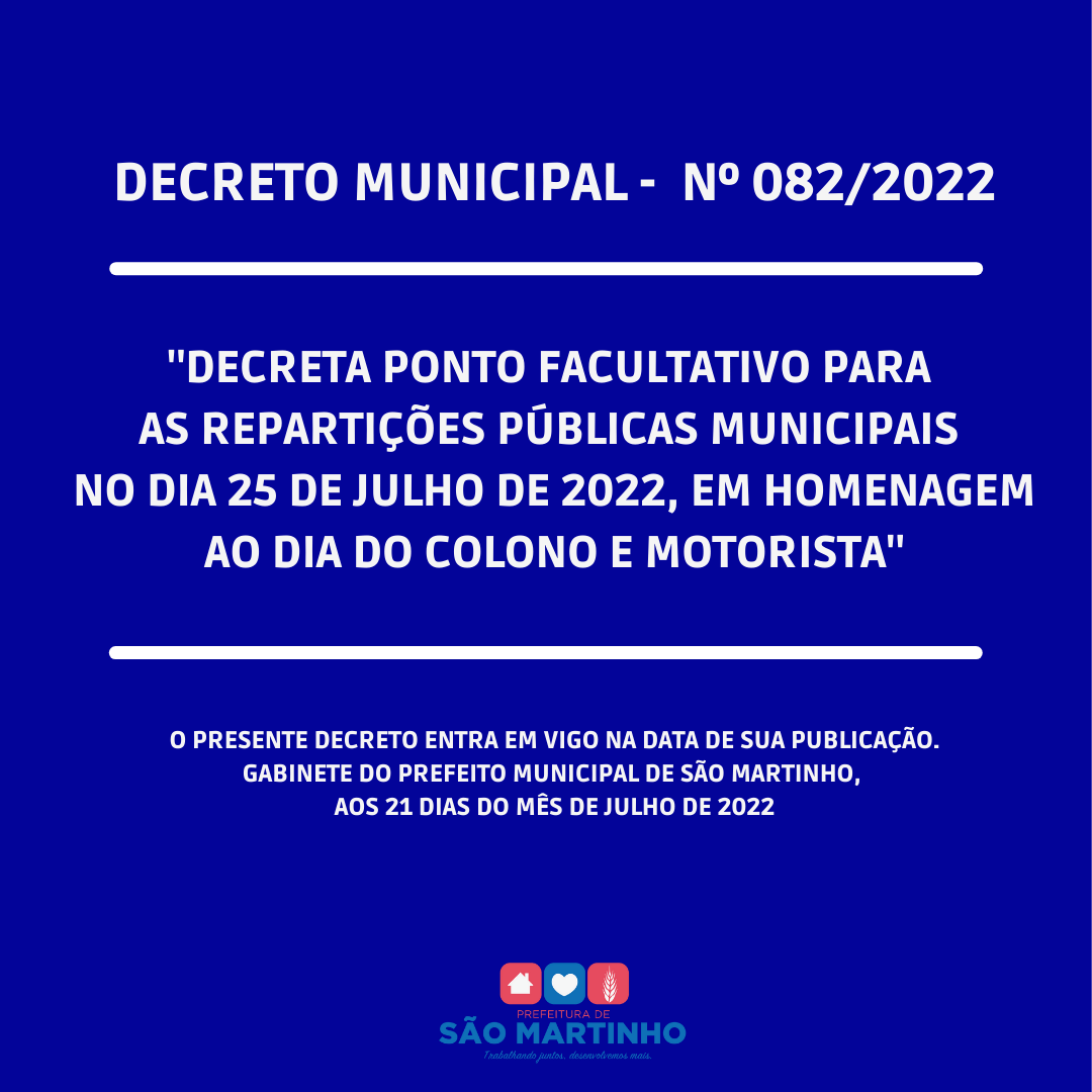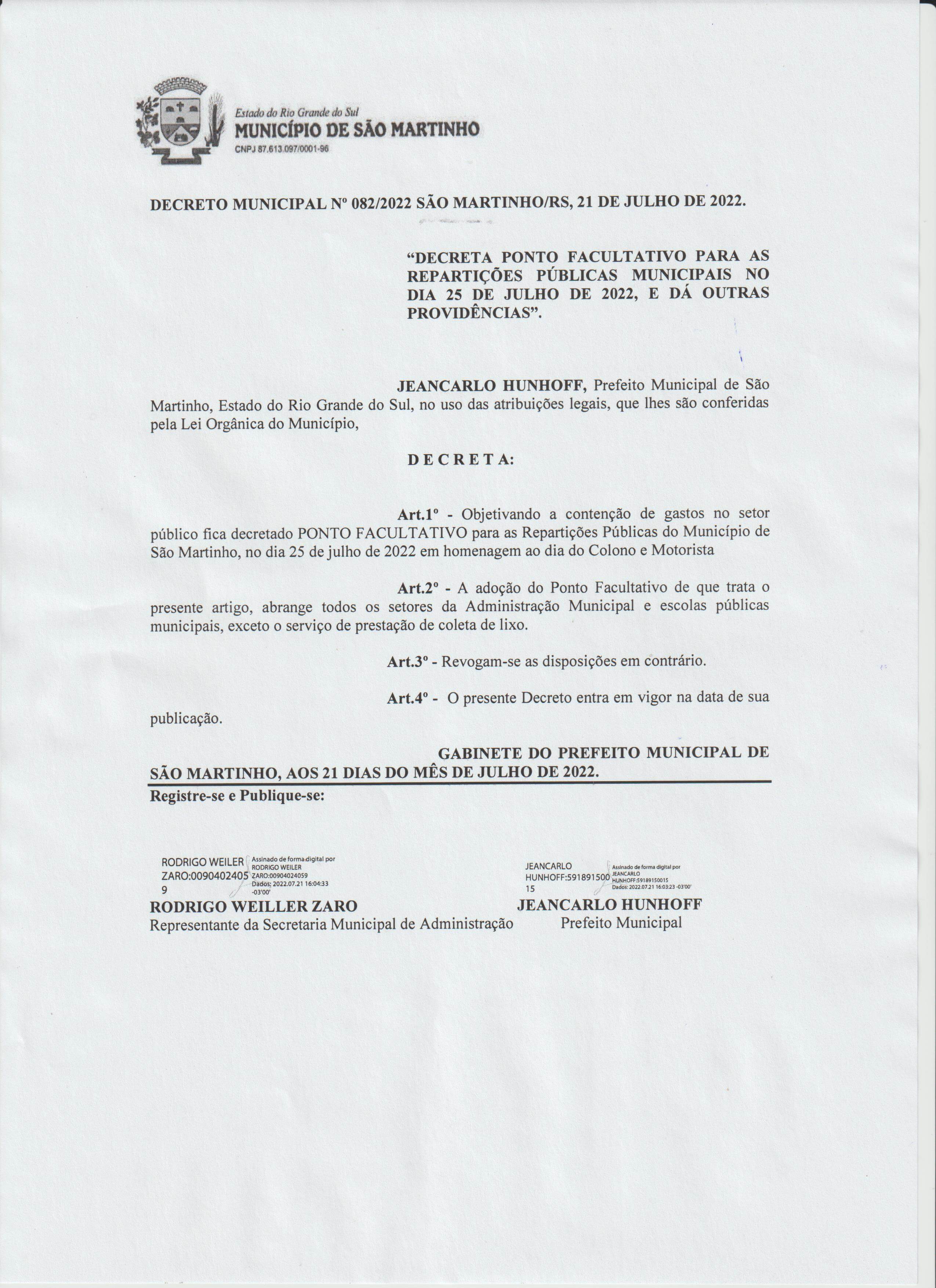 DECRETO MUNICIPAL Nº 082/2022, SÃO MARTINHO/RS, 21 DE JULHO DE 2022.