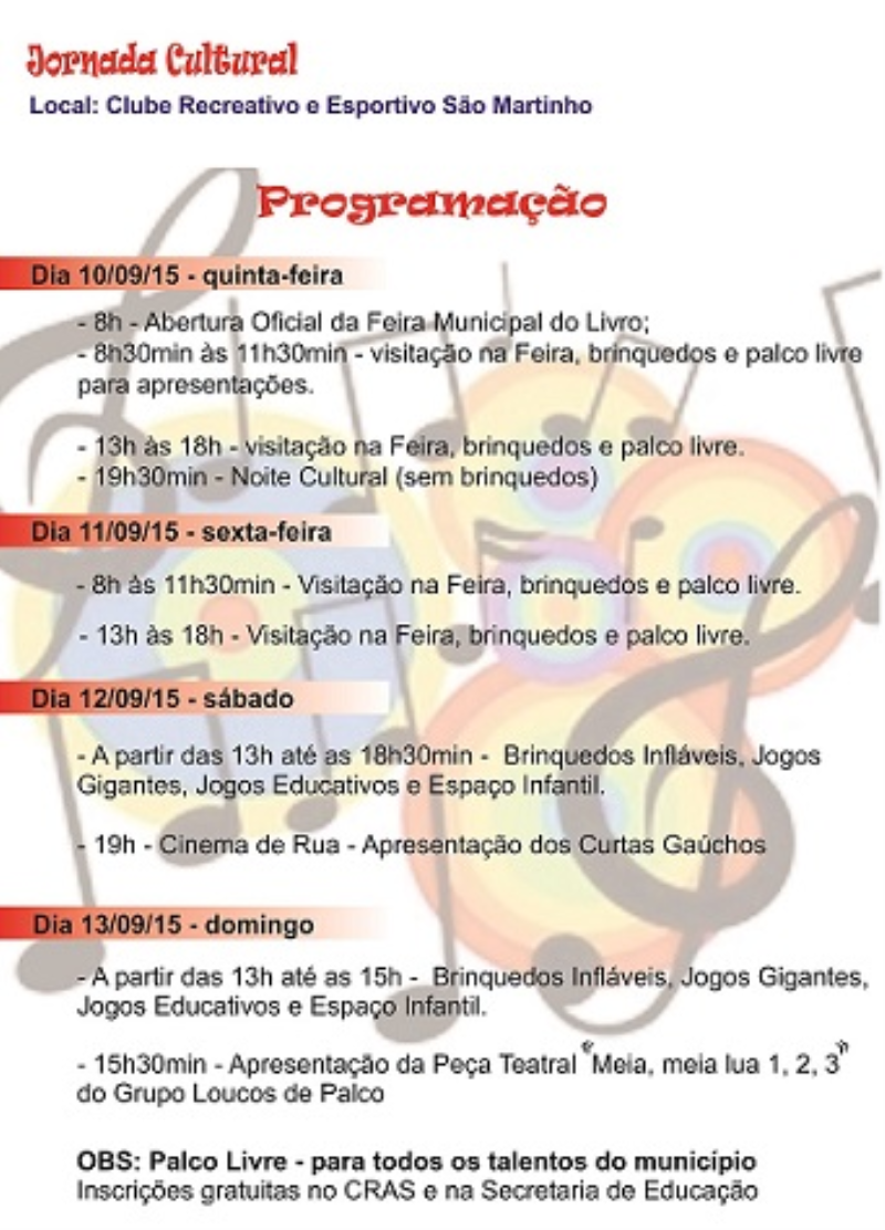 8h30min às 11h30min - visitação na Feira, brinquedos e palco livre.