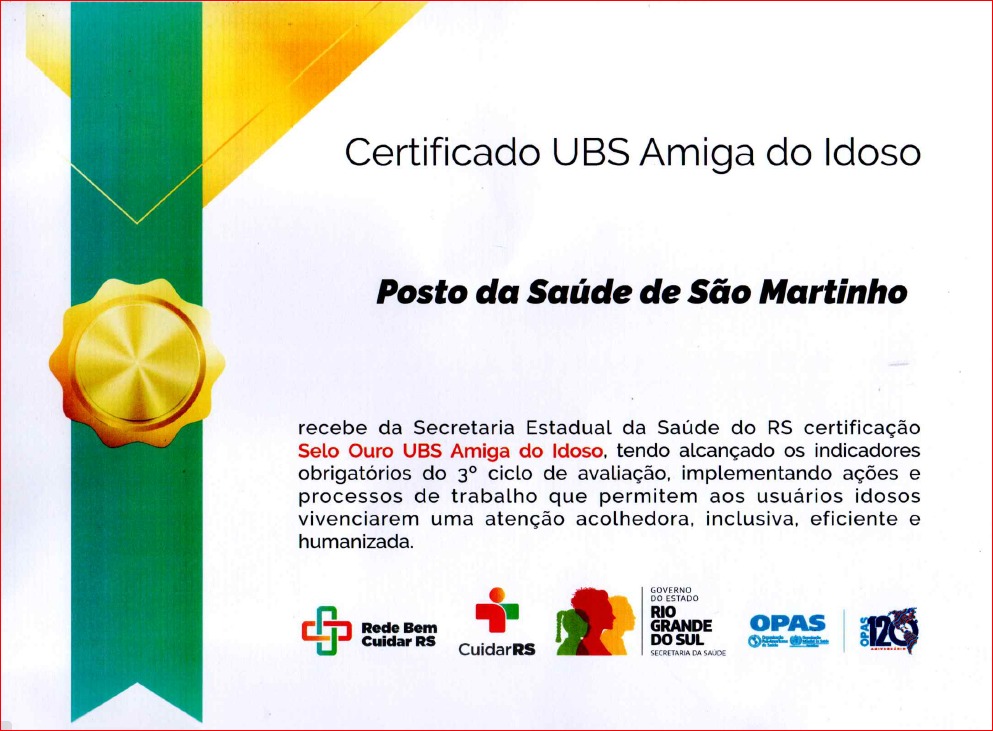 UNIDADE BÁSICA DE SAÚDE DE SÃO MARTINHO CONQUISTA SELO OURO AMIGA DO IDOSO - REDE BEM CUIDAR