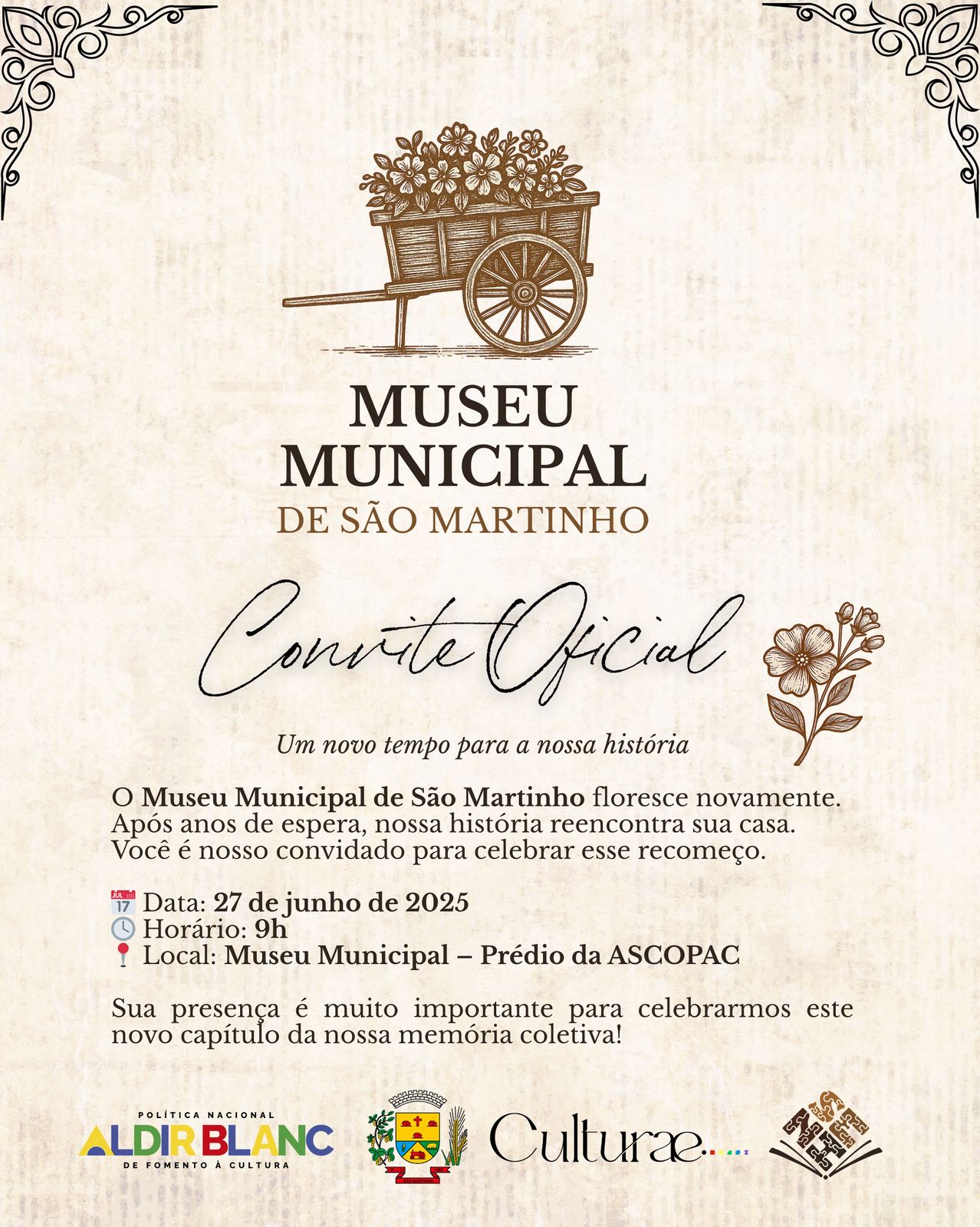 A Prefeitura de São Martinho convida você e sua família para a reinauguração do Museu Municipal, que acontece nesta sexta-feira, 27 de junho, às 9h, no prédio da ASCOPAC.